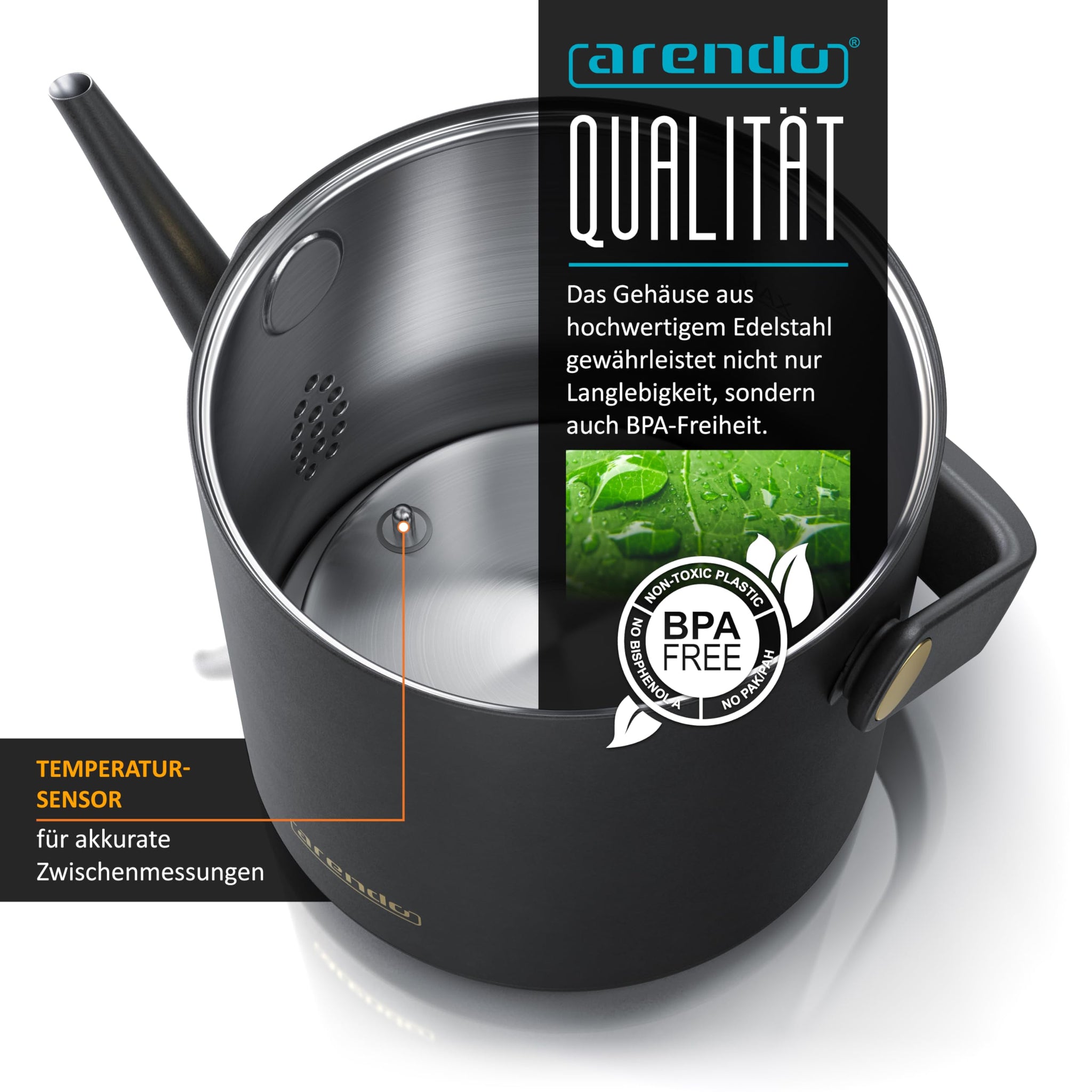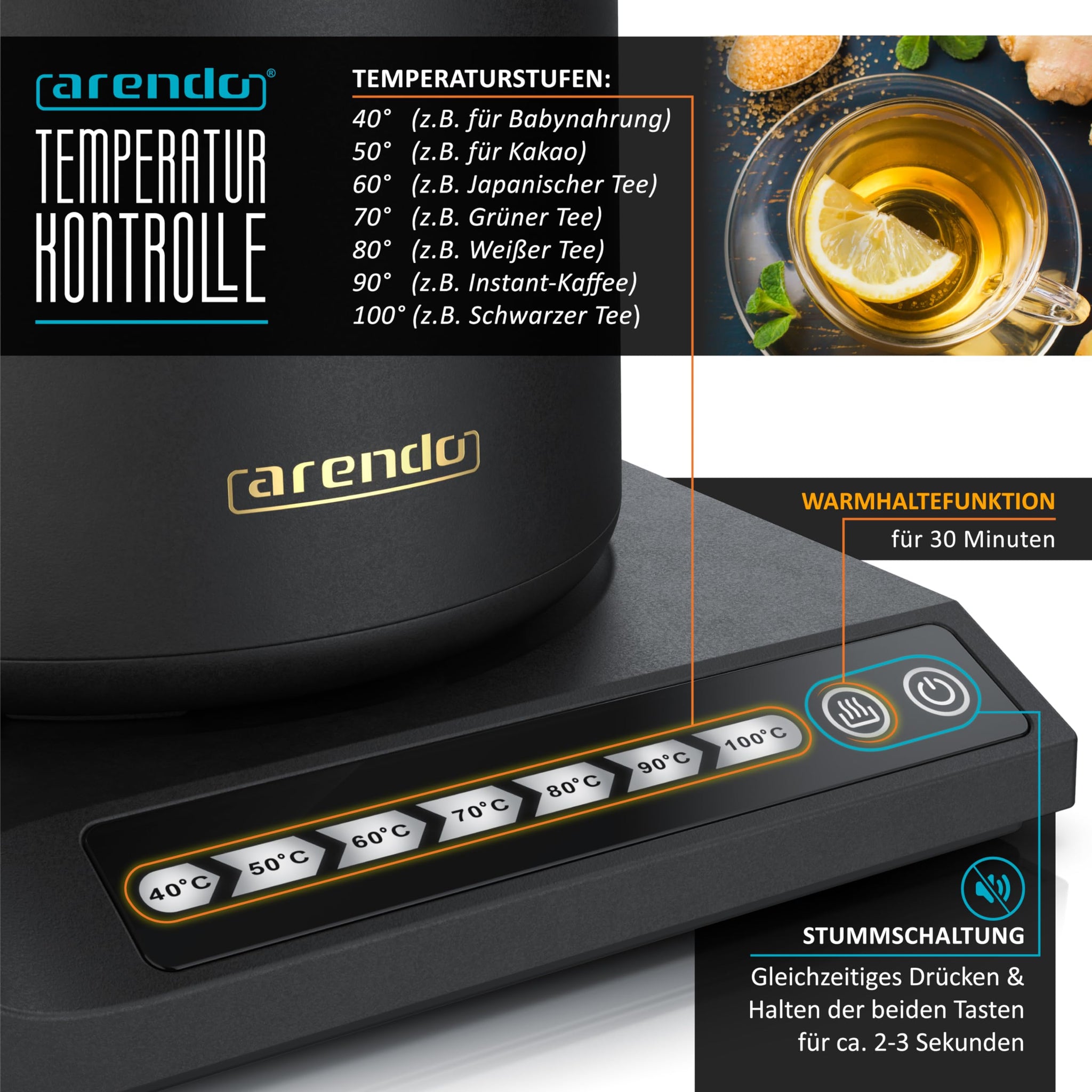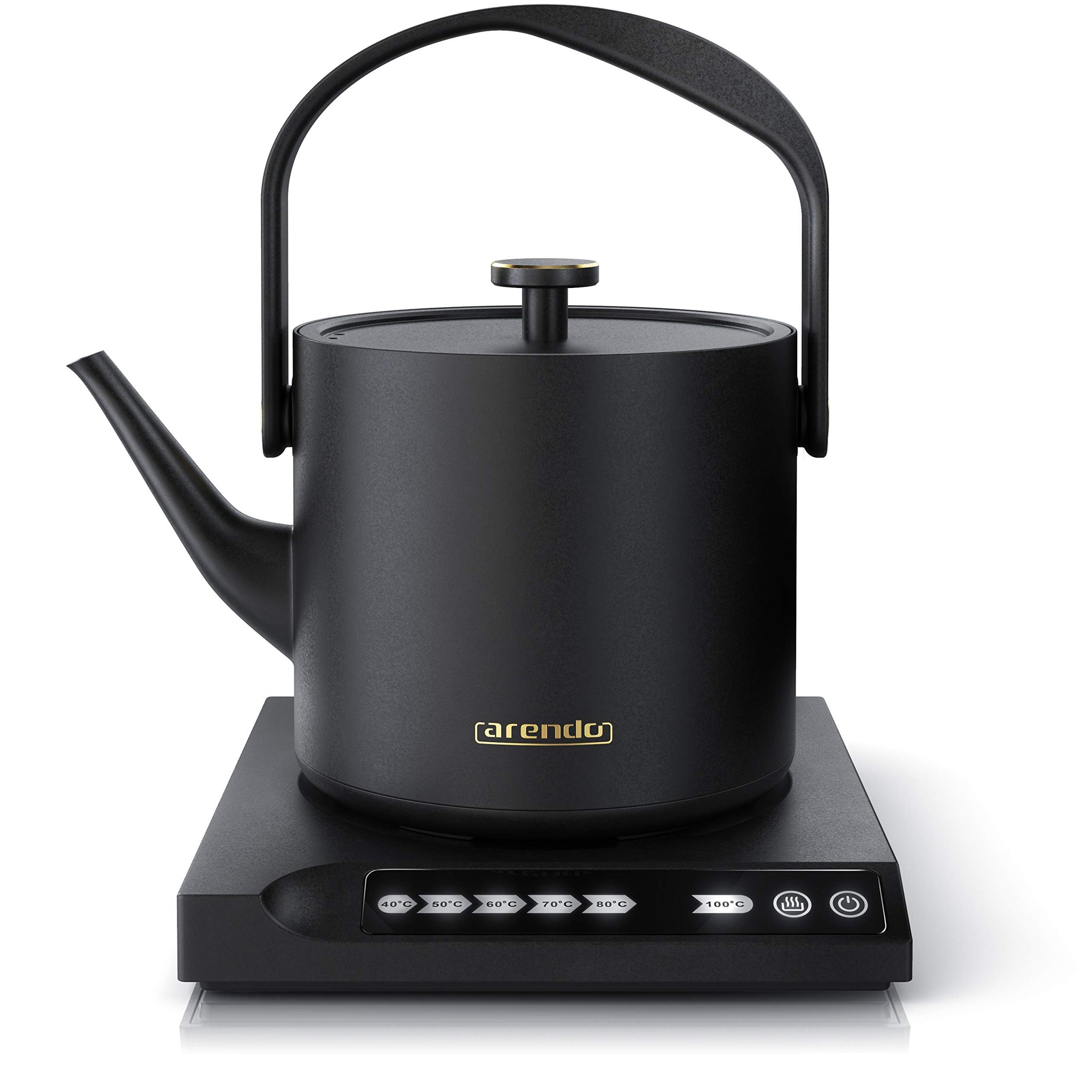 Arendo - Edelstahl Wasserkocher mit Temperatureinstellung - 40° bis 100° - Warmhaltefunktion 30 Minuten – 0,5 Liter – Sensortasten – 360° Basis – Retro Design - Schwarz