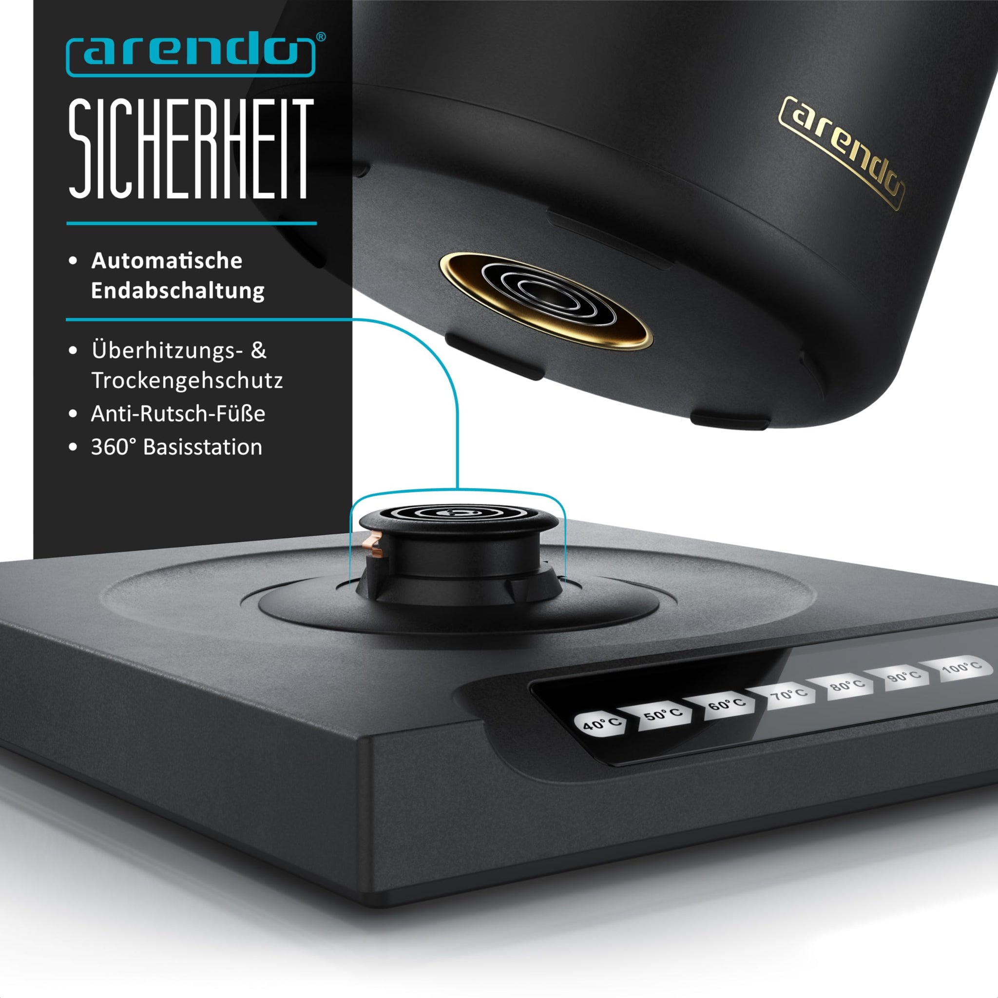 • Weitere Funktionen: Automatisches Abschalten beim Kochen. | Schutz vor Austrocknung und Überhitzung. | Signalton beim Start und bei der Beendigung; abschaltbar | Weiße LED-Anzeige .| 360° Basisstation.